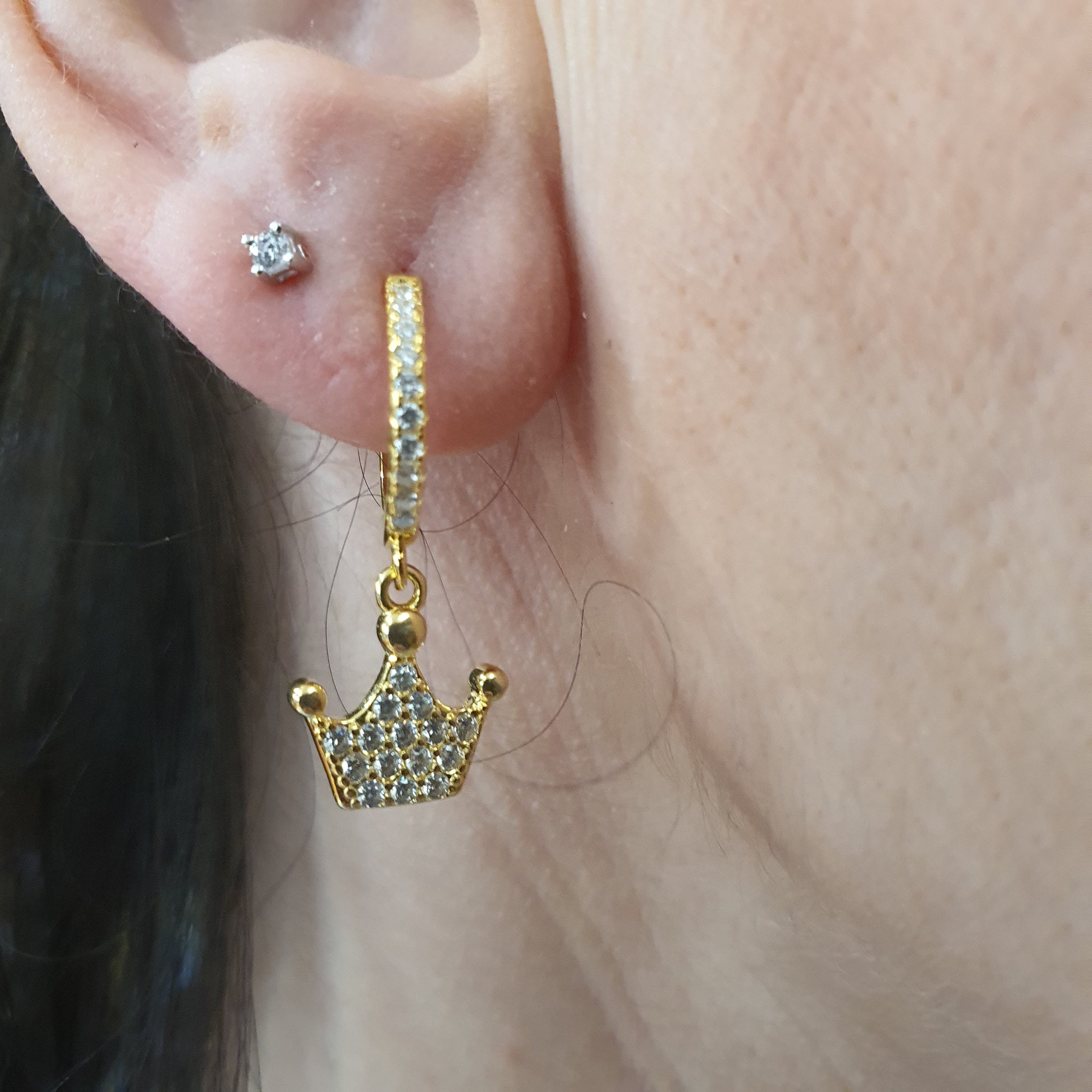 Coppia di orecchini a cerchietto con corona pendente, provengono dalla nostra ricerca dei gioielli che più ci hanno ispirati e hanno accolto la nostra passione per l'eleganza intramontabile della raffinatezza. La femminilità più profonda risiede nei dettagli, il lato positivo è riuscire a coglierli.