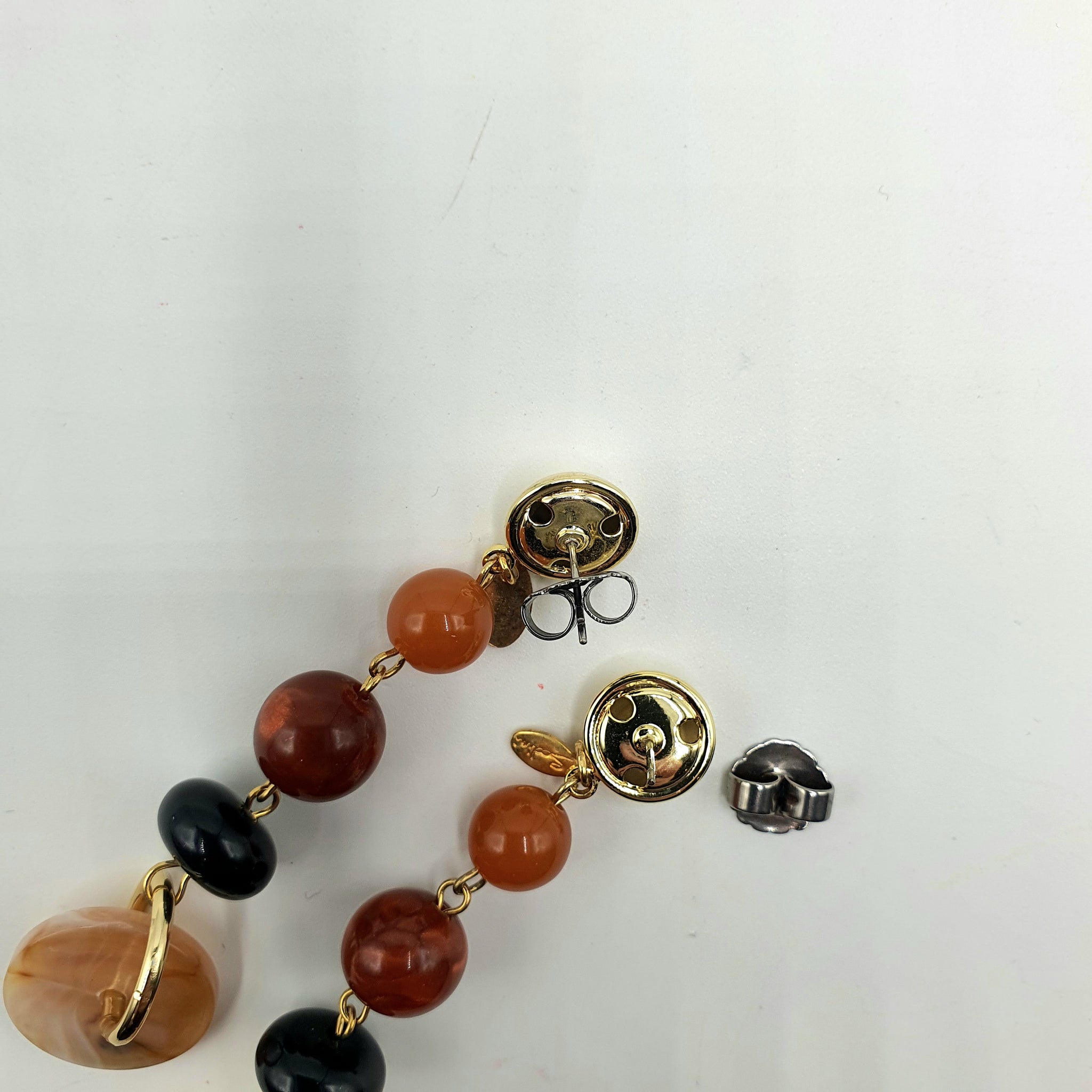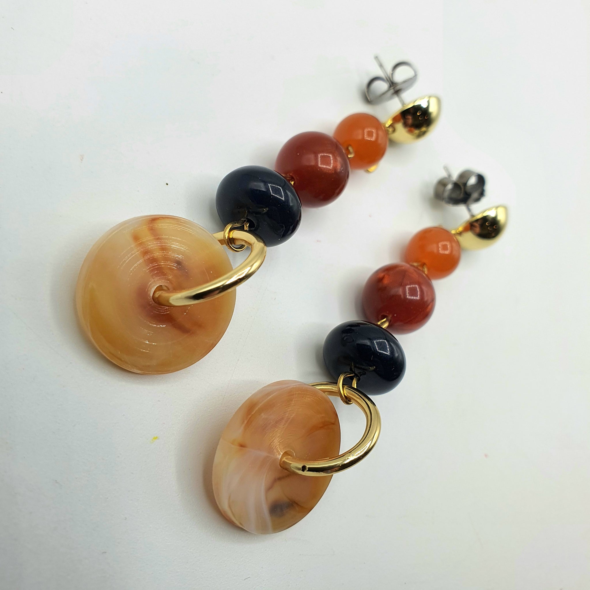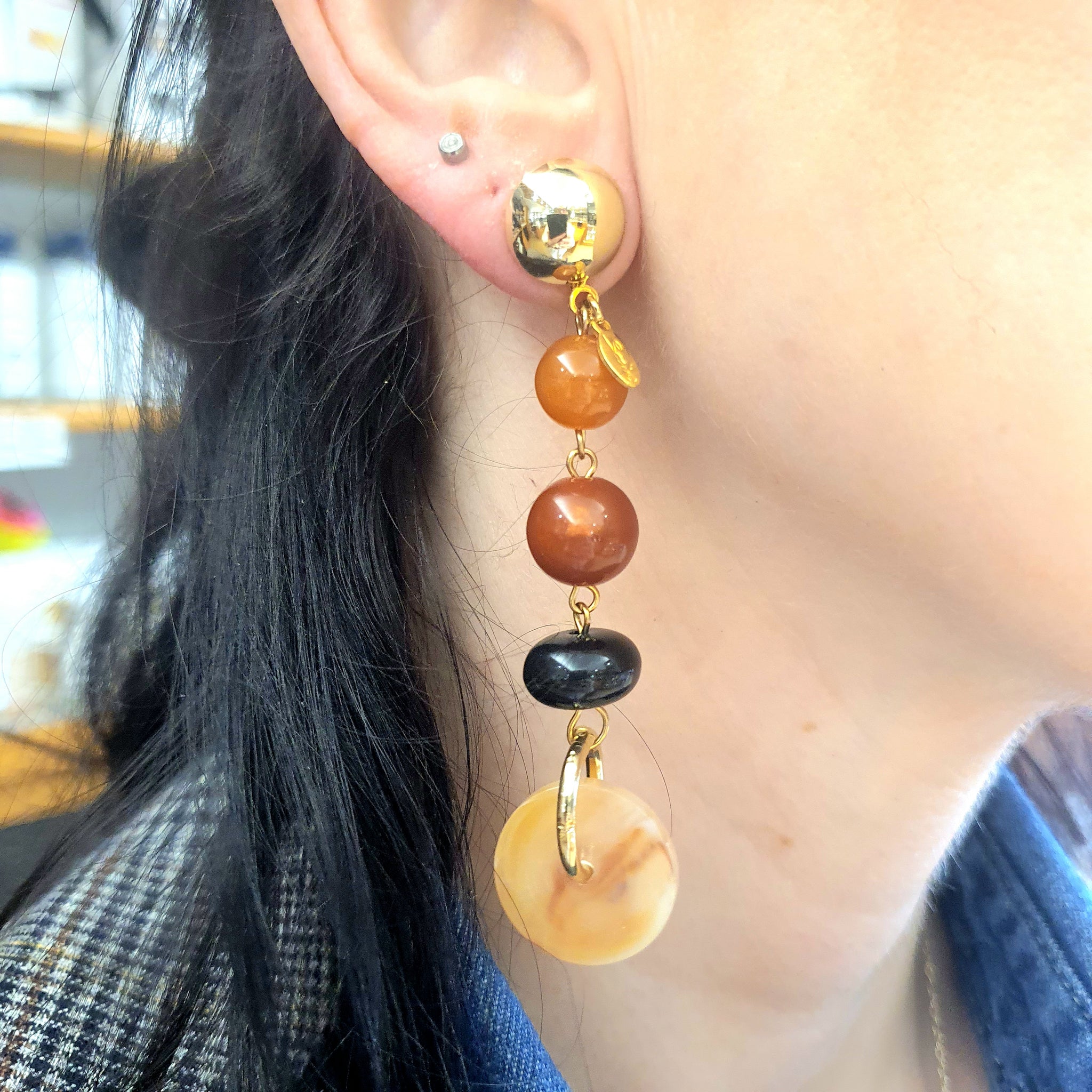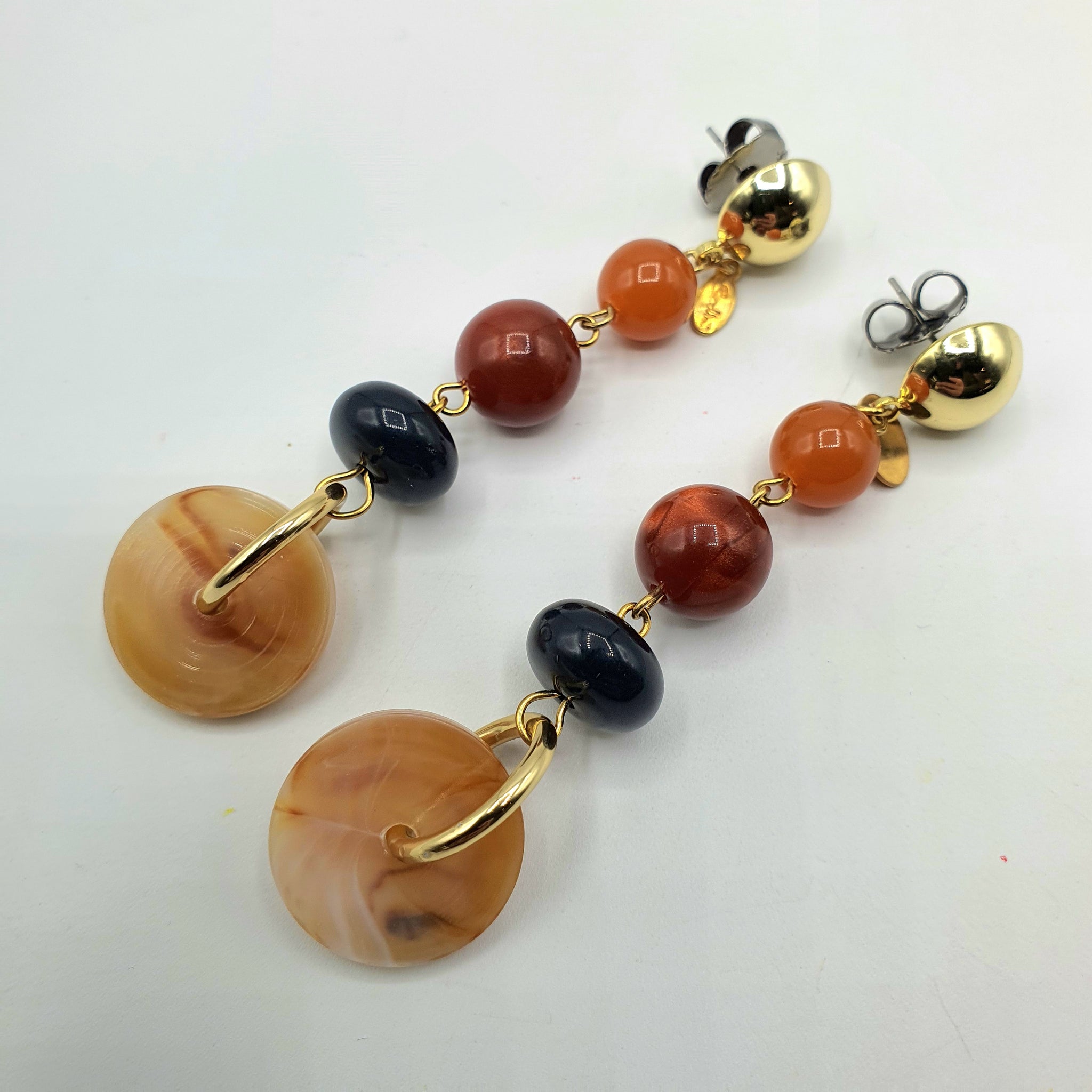 Coppia di orecchini in metallo placcato oro con resina color caramello e nero, provengono dalla nostra ricerca dei gioielli che più ci hanno ispirati e hanno accolto la nostra passione per l'eleganza intramontabile della raffinatezza. La femminilità più profonda risiede nei dettagli, il lato positivo è riuscire a coglierli.
