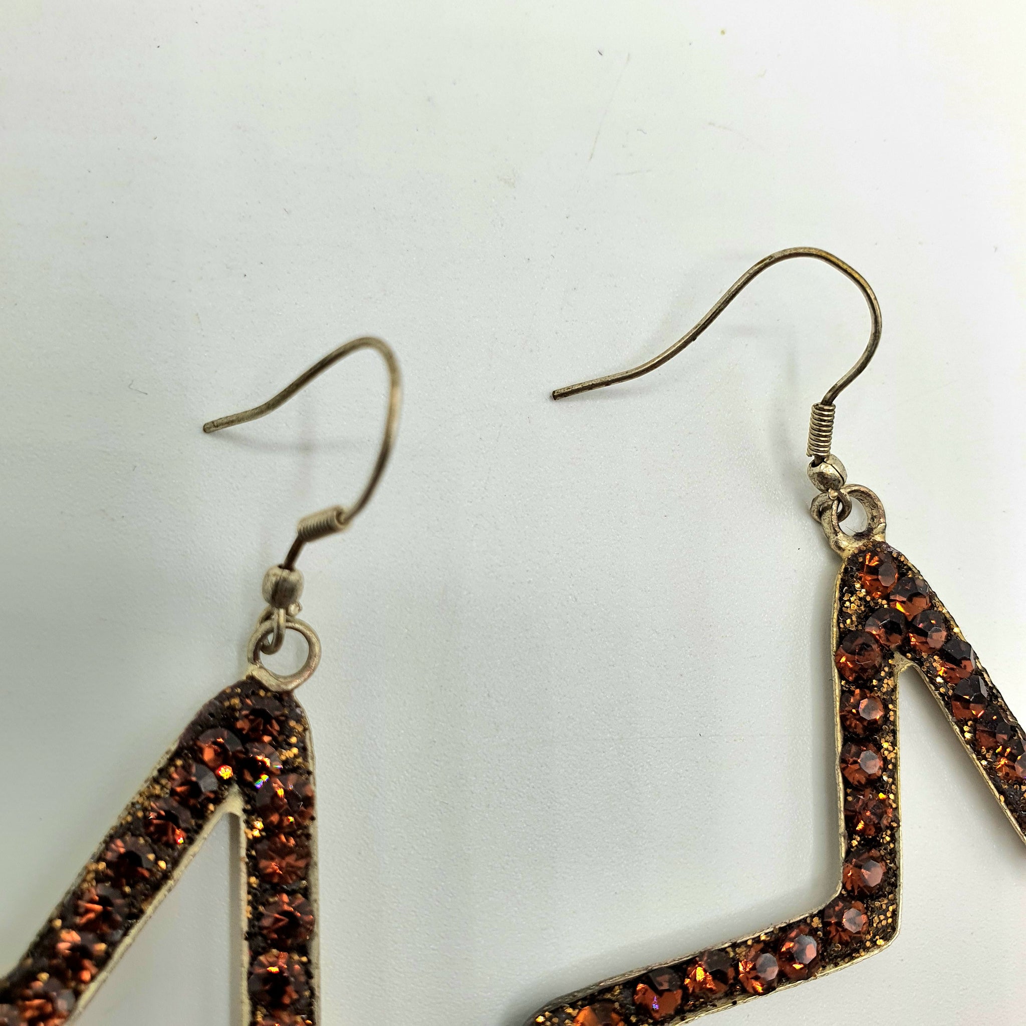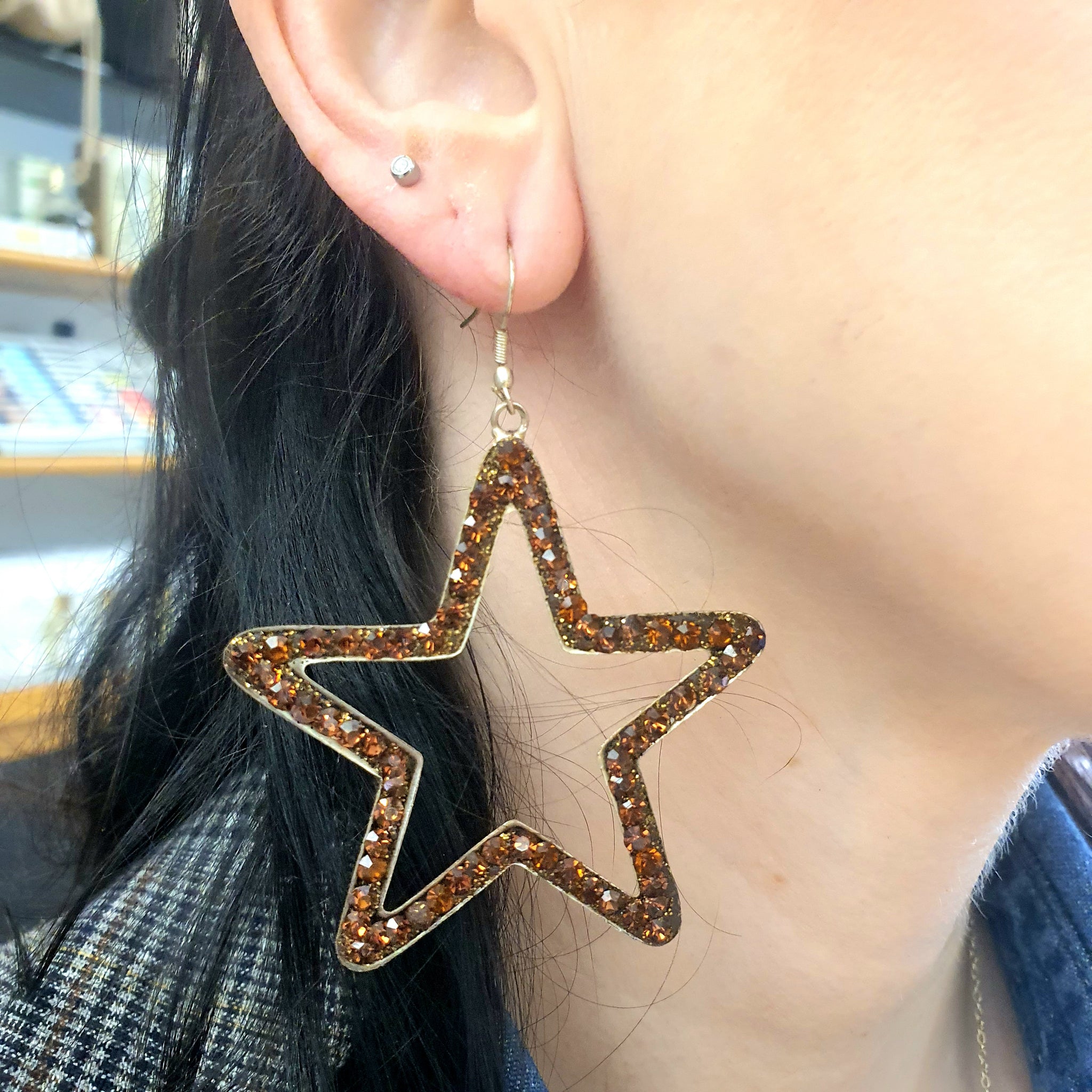 Coppia di orecchini pendenti a forma di stella con strass marroni. Provengono dalla nostra ricerca dei gioielli che più ci hanno ispirati e hanno accolto la nostra passione per l'eleganza intramontabile della raffinatezza. La femminilità più profonda risiede nei dettagli, il lato positivo è riuscire a coglierli.