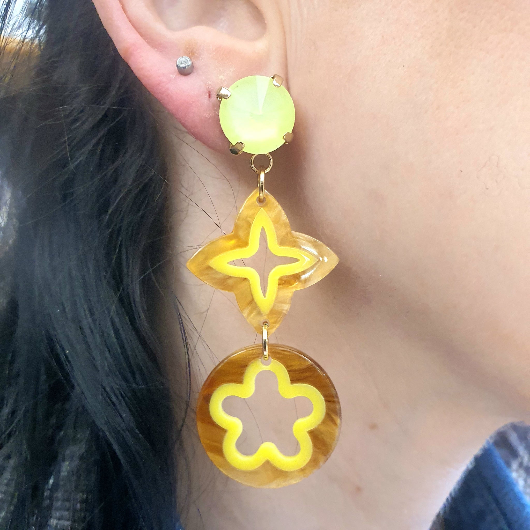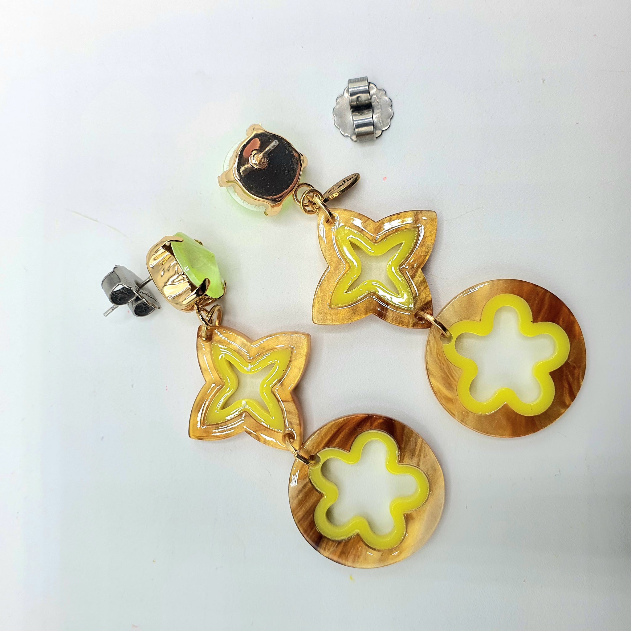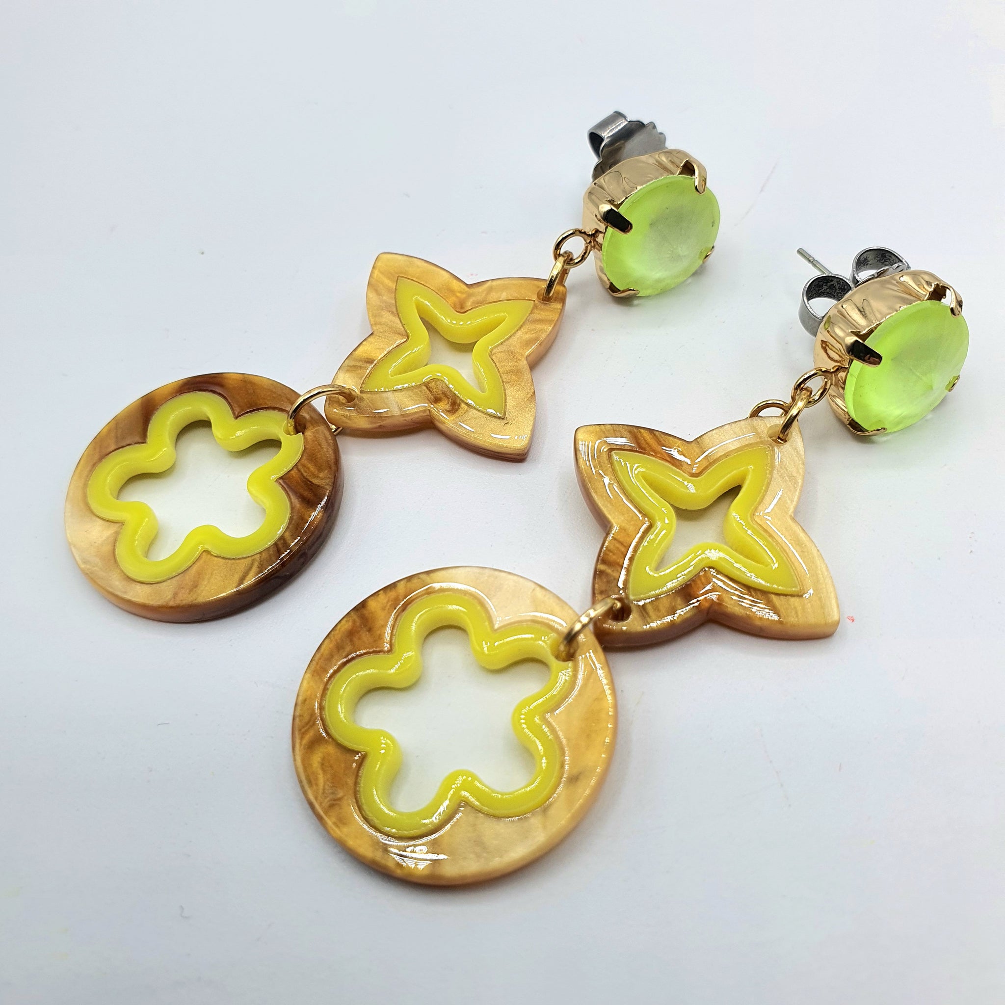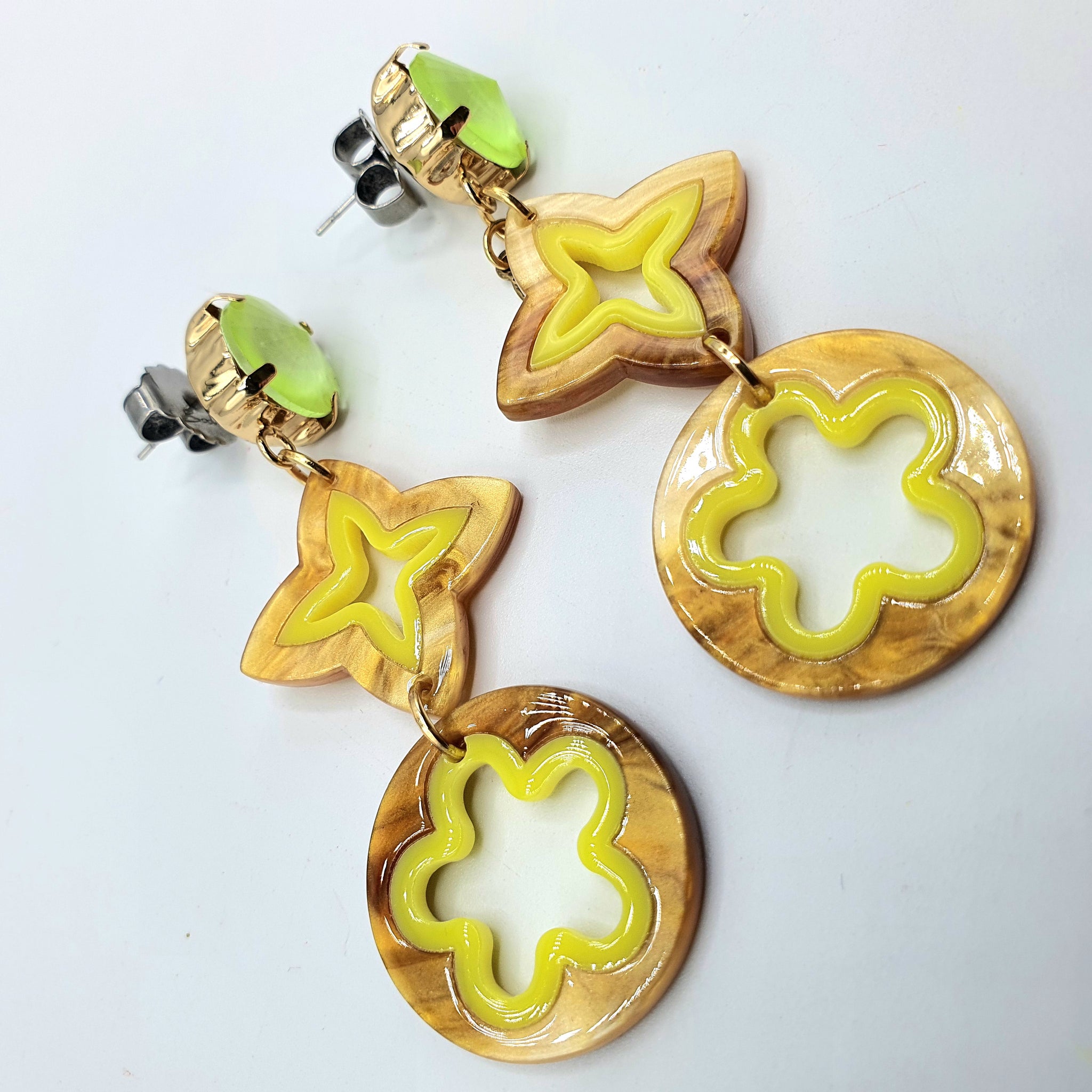 Coppia di orecchini pendenti tondi in resina color caramello e verde acido e placcato oro, provengono dalla nostra passione per l'eleganza intramontabile della raffinatezza. La femminilità più profonda risiede nei dettagli, il lato positivo è riuscire a coglierli.