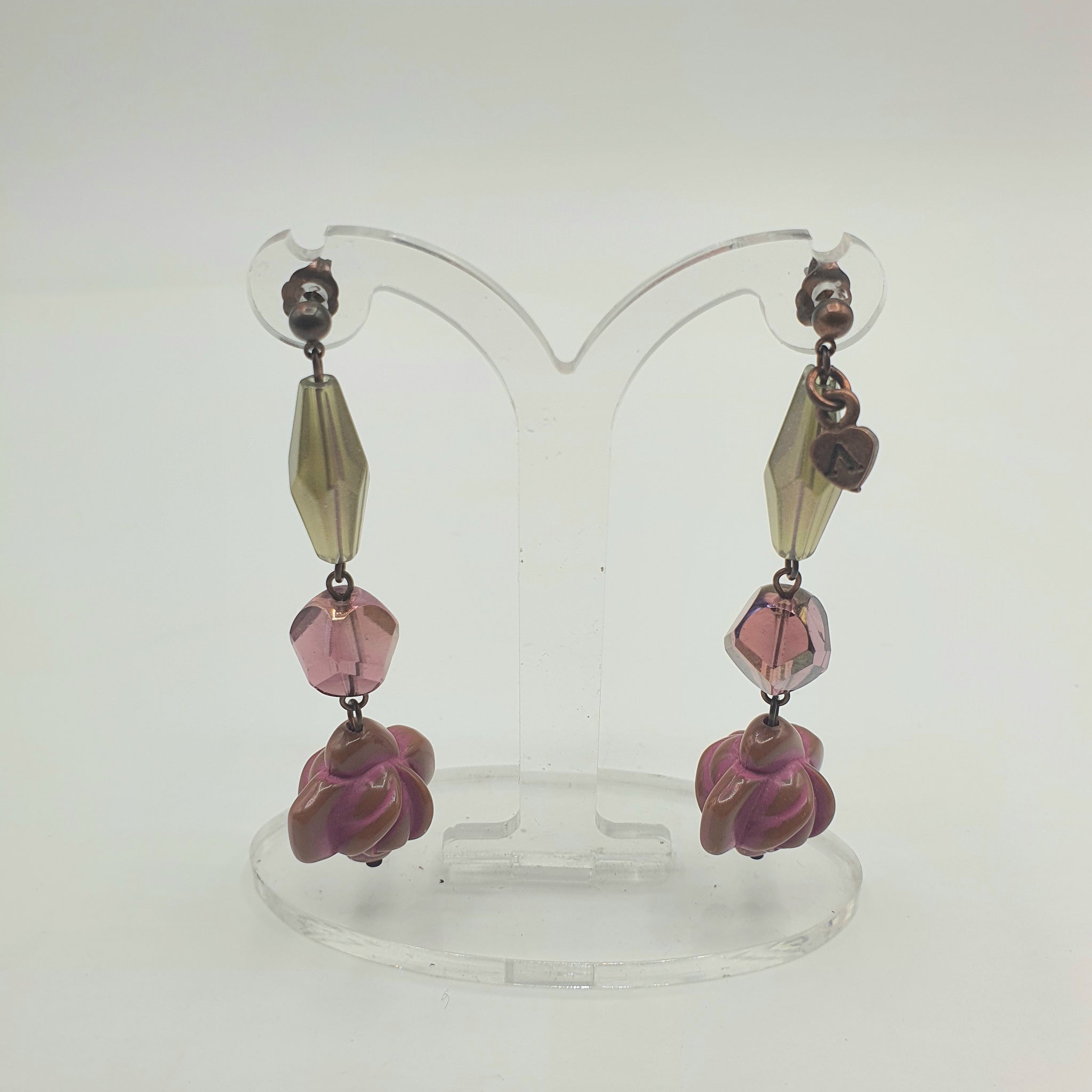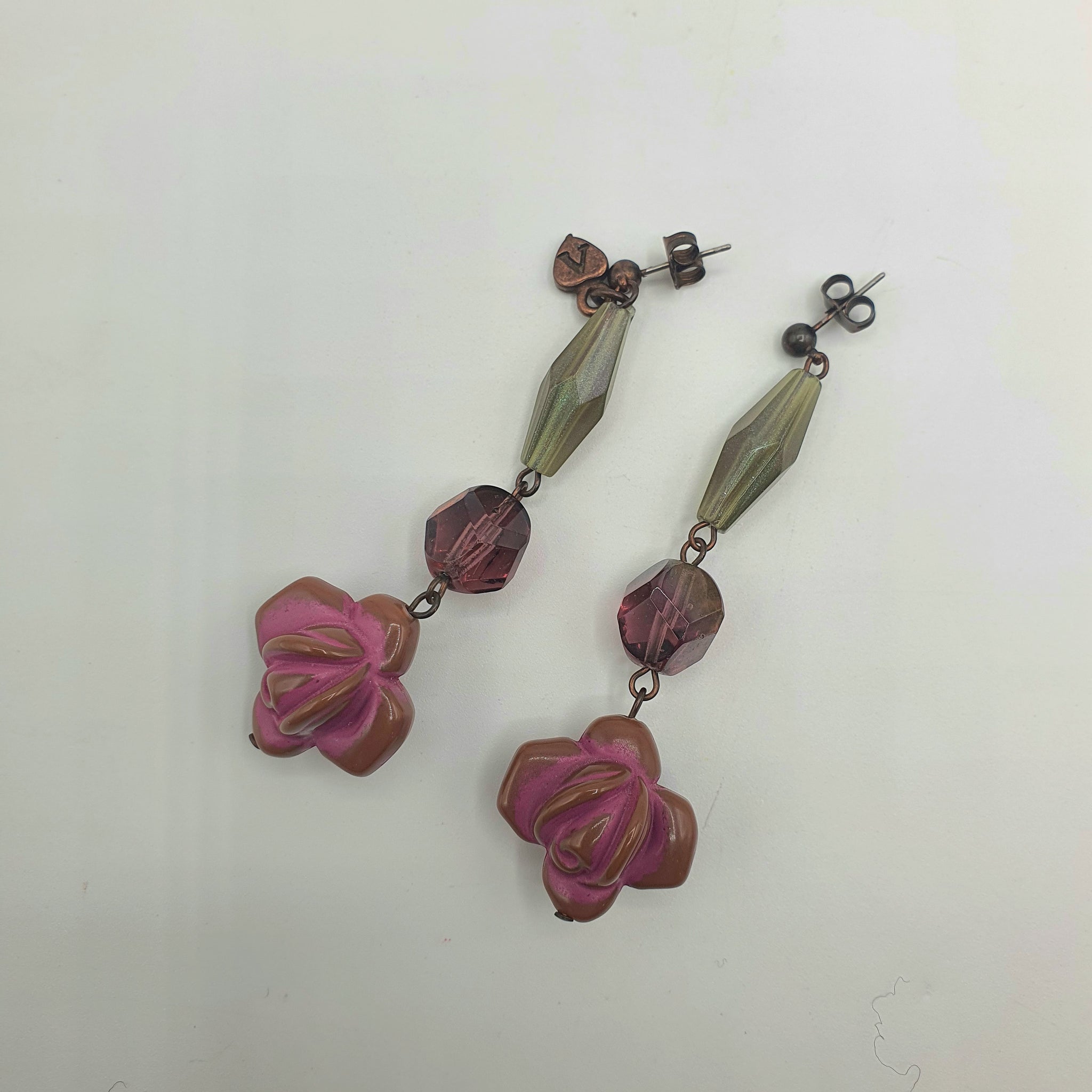 Coppia di orecchini in metallo placcato color bronzo, anallergici, con resine allungate grigie, un cristallo bordeaux e per finire una rosa in resina smaltata color rosa carne e tortora.