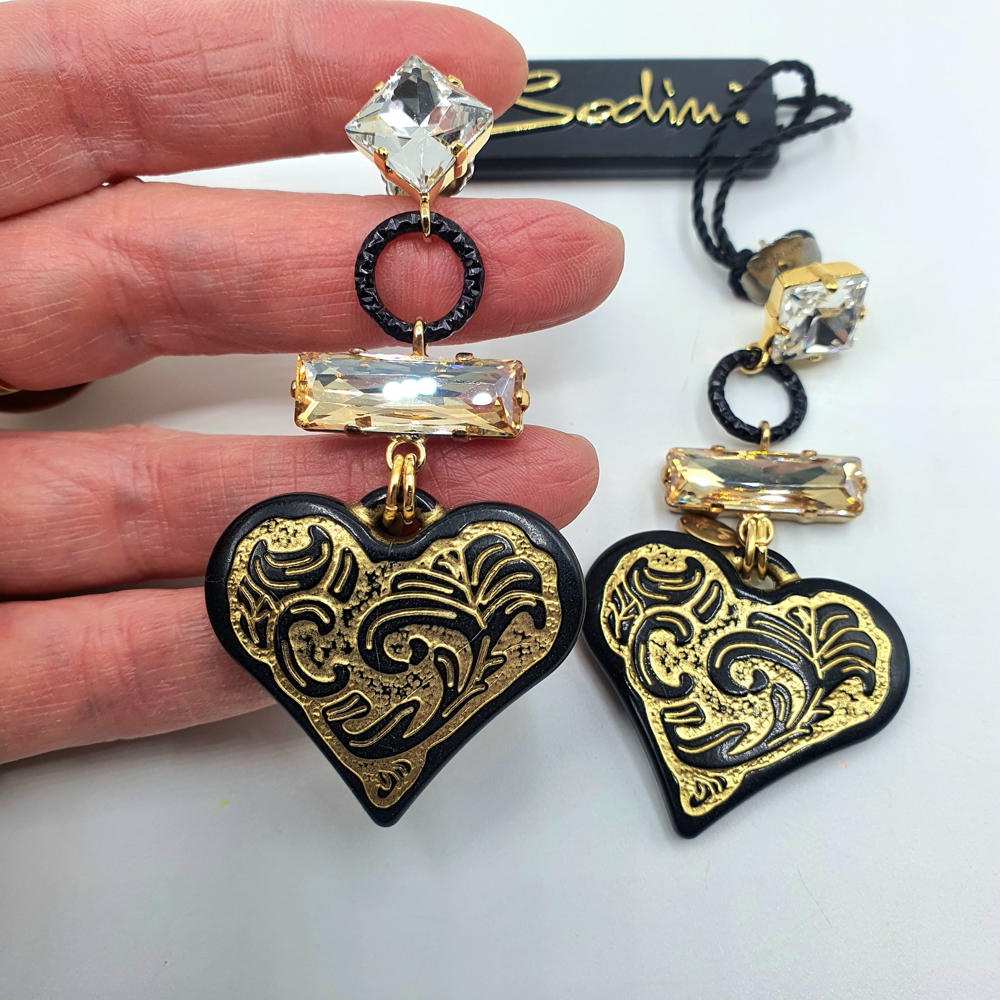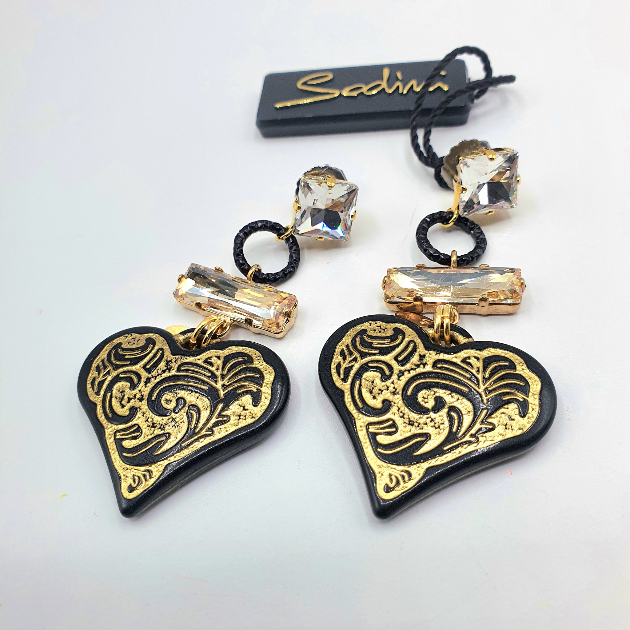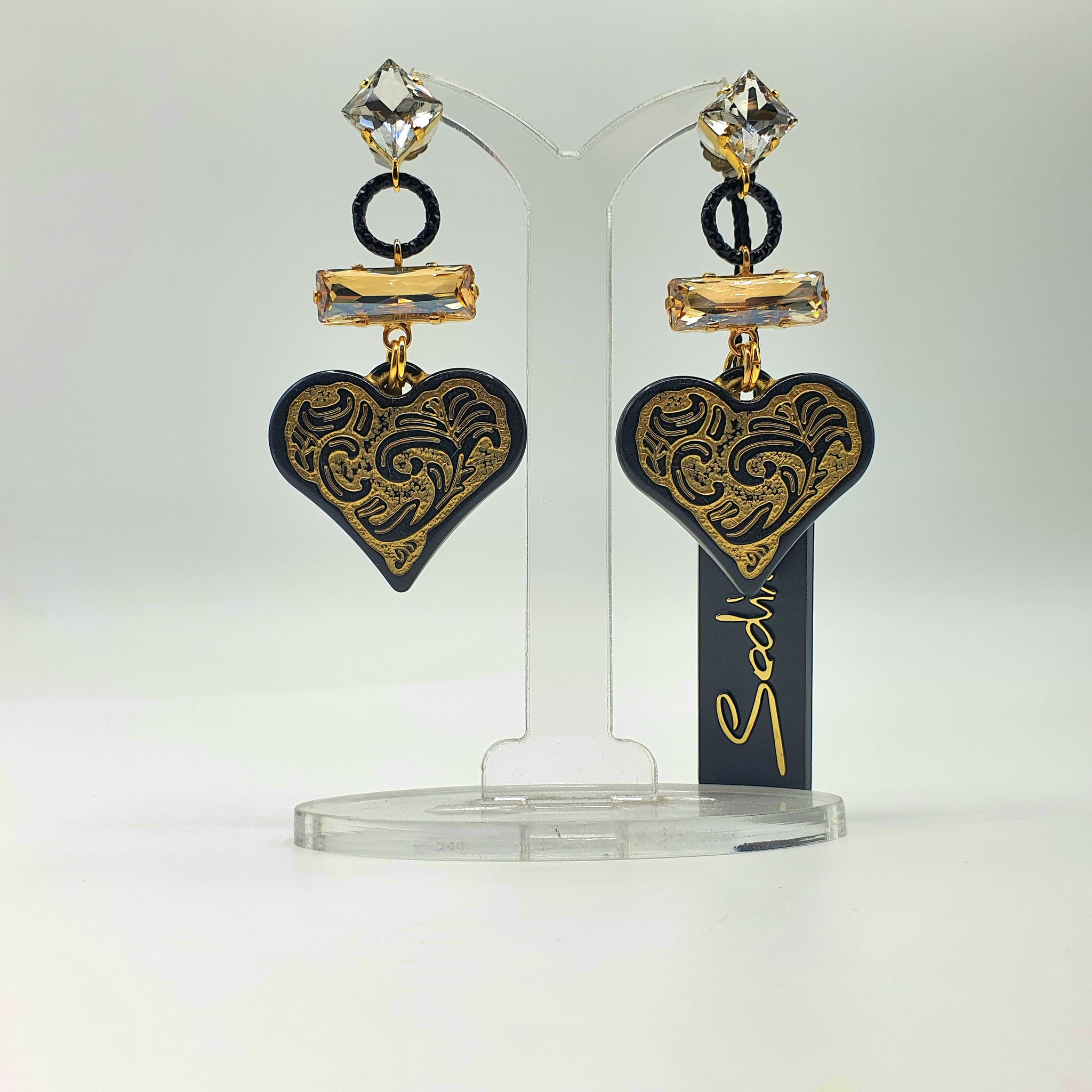 Orecchini pendenti in metallo placcato oro, anallergici con cristalli e cuore nero