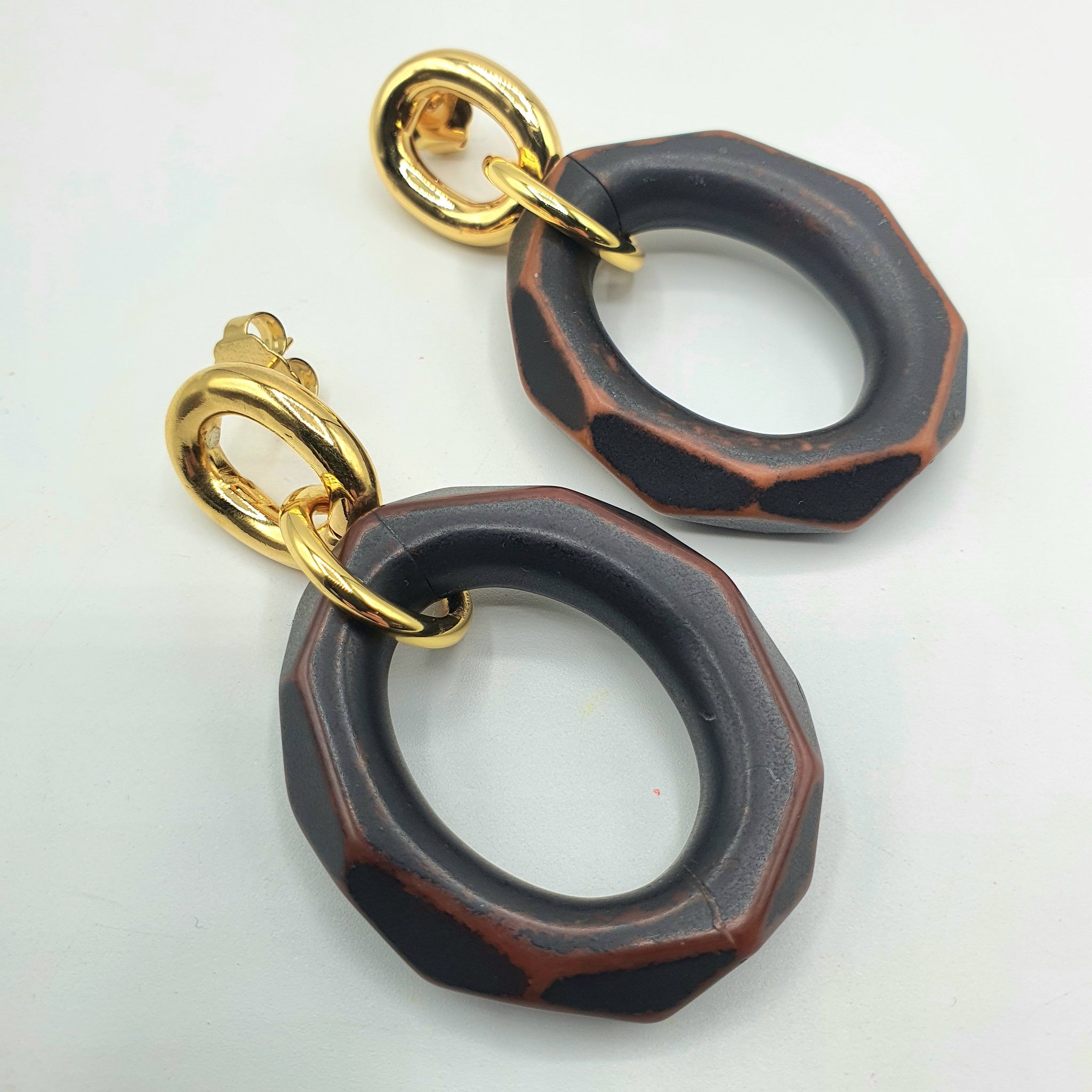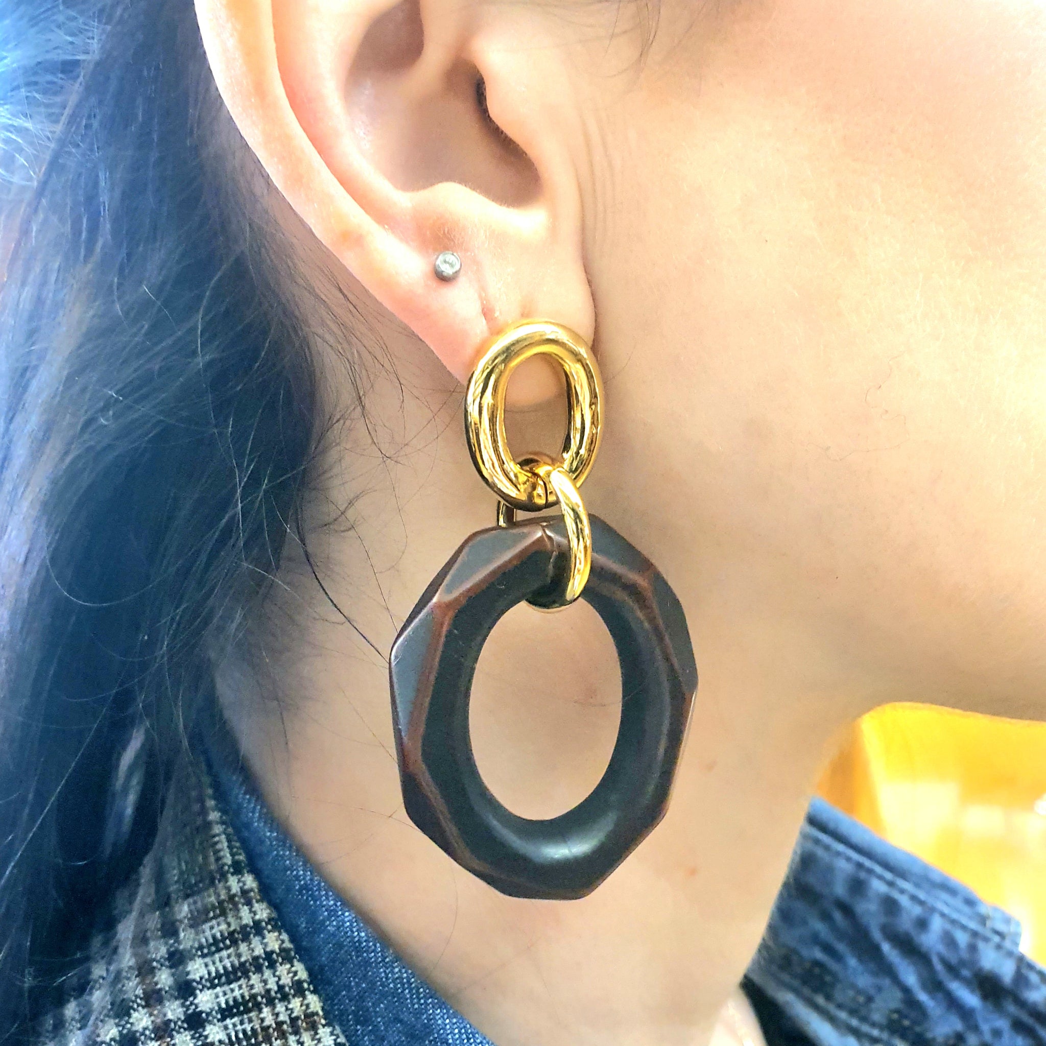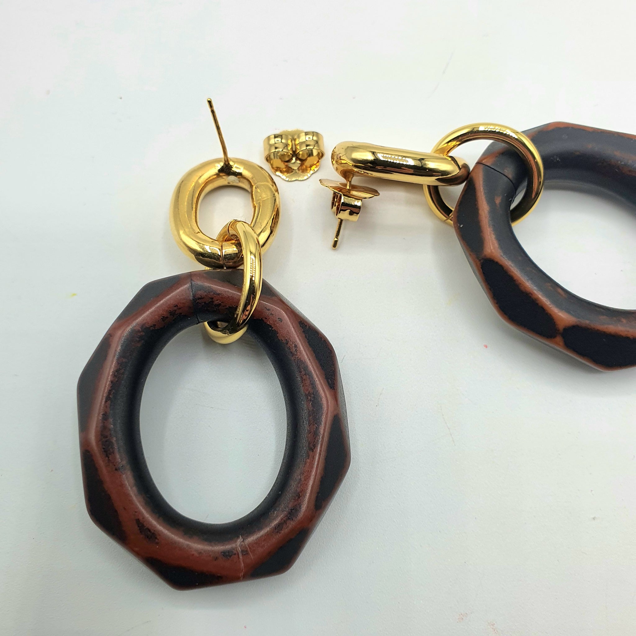 Coppia di orecchini pendenti ovali in resina marrone e ottone placcato oro,  anallergici . Provengono dalla nostra ricerca dei gioielli che più ci hanno ispirati e hanno accolto la nostra passione per l'eleganza intramontabile della raffinatezza. La femminilità più profonda risiede nei dettagli, il lato positivo è riuscire a coglierli.